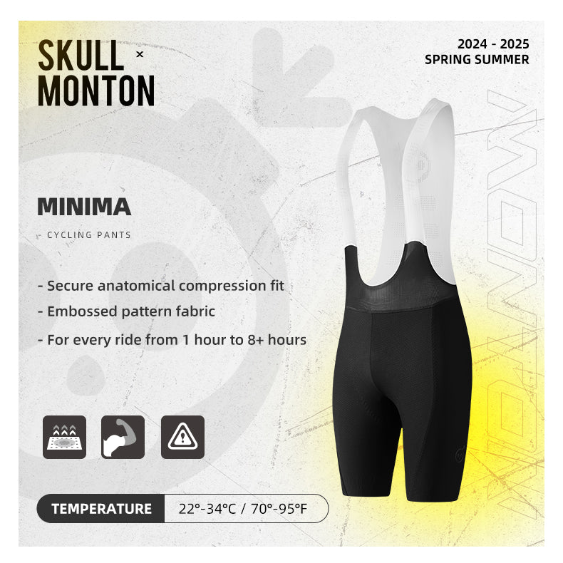 The Minima Series sets the bar for ultimate performance, comfort, and style. It consists of deluxe cycling must-haves that every cyclist will want in their wardrobe. These cycling bib shorts are designed with unbeatable comfort in mind, perfect for rides lasting anywhere from 1 hour to 8+ hours, whether on a TT or road bike. The bibs are crafted from pre-dyed compression fabric to enhance circulation and provide muscle support for maximum freedom of movement. Plus, the bib straps are laser-perforated for ventilation and a chic touch. A fabric-embedded silicone leg gripper keeps the shorts in place, ensuring a snug anatomical fit. Featuring a specially designed multi-layer 0184 chamois padding, these bib shorts are ergonomically tailored for all-around comfort. The innovative anti-vibration thickness of 3-14mm ensures the perfect ride. The raised embossed pattern on the shorts adds a stylish tactile feel and exudes luxury.